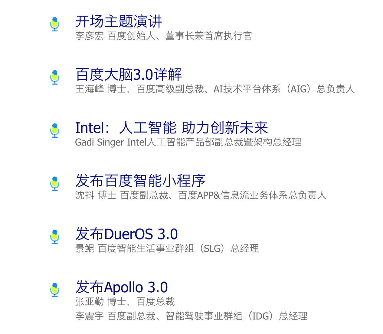 此次百度开发者大会主论坛的演讲顺序也耐人寻味。在李彦宏开场演讲后,AI 技术平台负责人王海峰登场,详细解读了百度大脑 3.0 的技术架构,随后则是负责百度 APP与信息流的负责人沈抖[1],后面才是 DuerOS 以及 Apollo 。