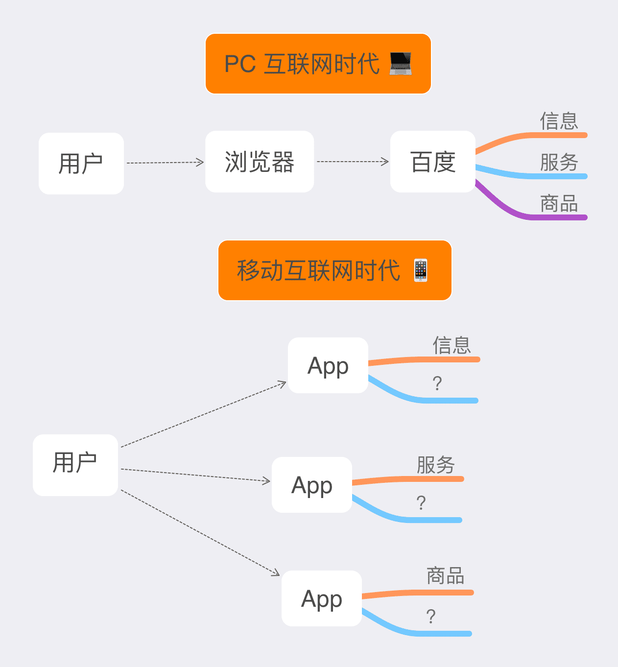 其次,用户的消费习惯转向各种 App,这不仅对百度,也是对包括 Google 在内的所有搜索公司一次巨大冲击。用户不再通过手机浏览器里的搜索框搜索信息,而是转向各种单独的 App 寻找信息,如果说在 PC 时代可以有一个万能的搜索,那么移动互联网时代,则是各种垂直类信息信息分发商的黄金时代,比如淘宝、京东本质就是一种电商信息分发商。